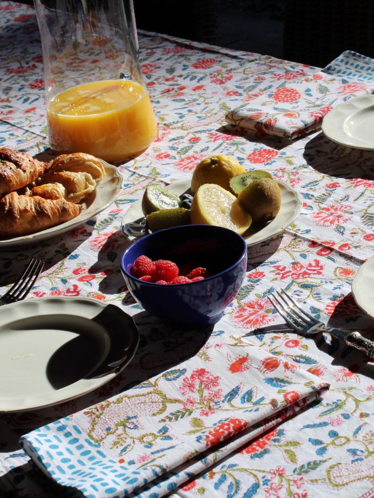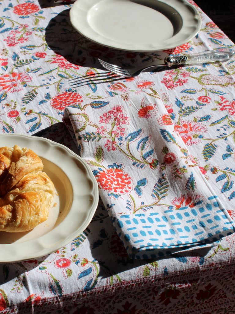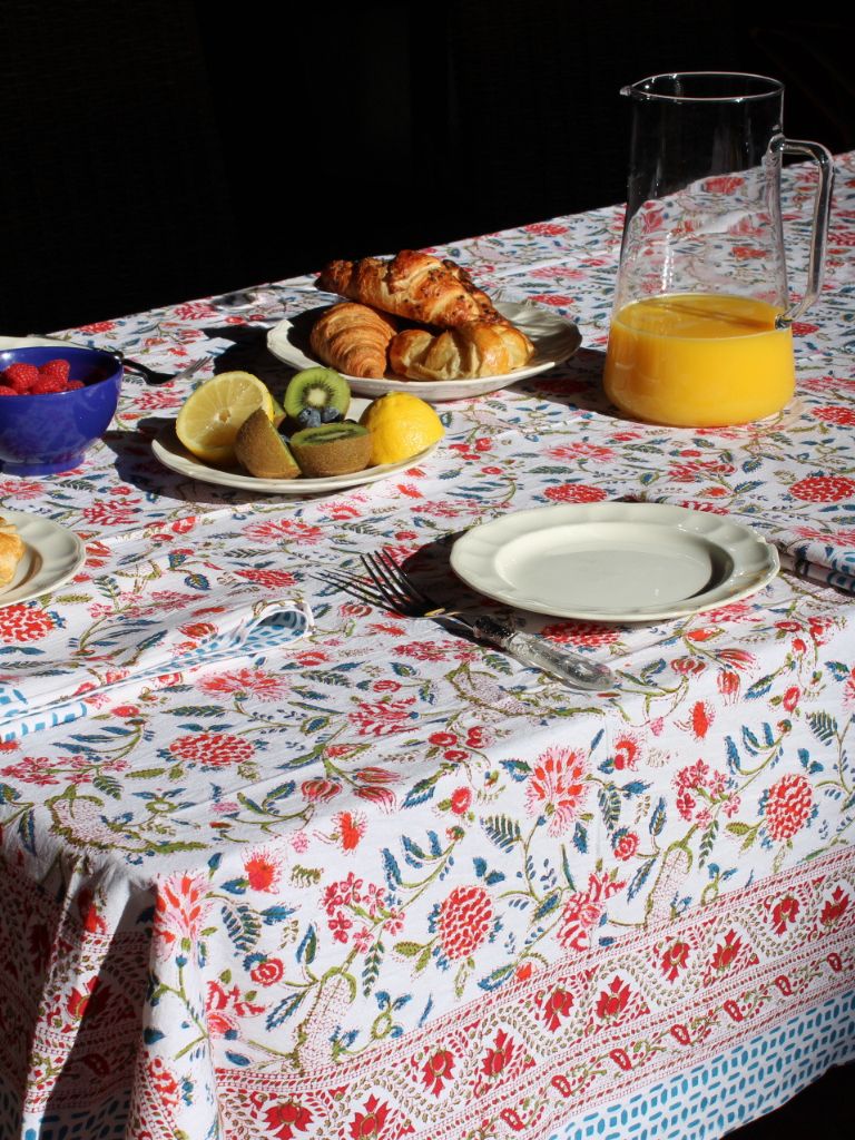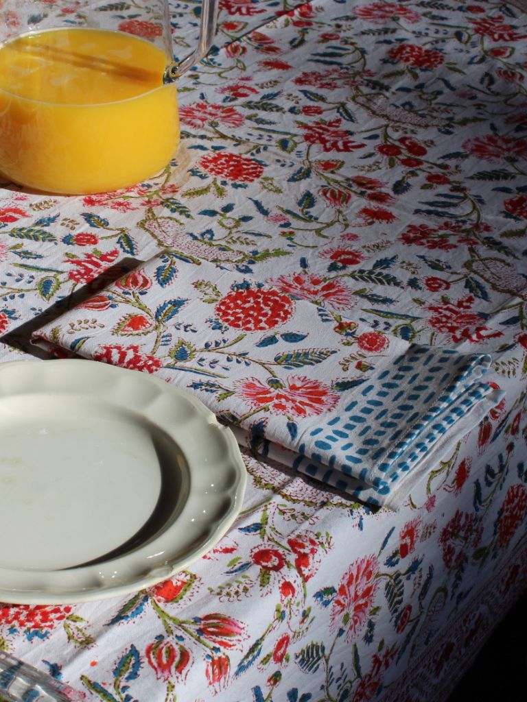 Mantel 100% algodón con estampado de flores en tonos rojos y azules.