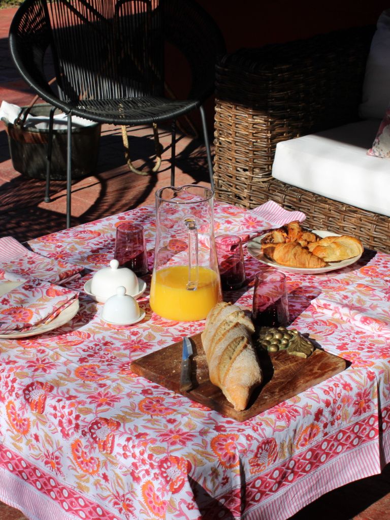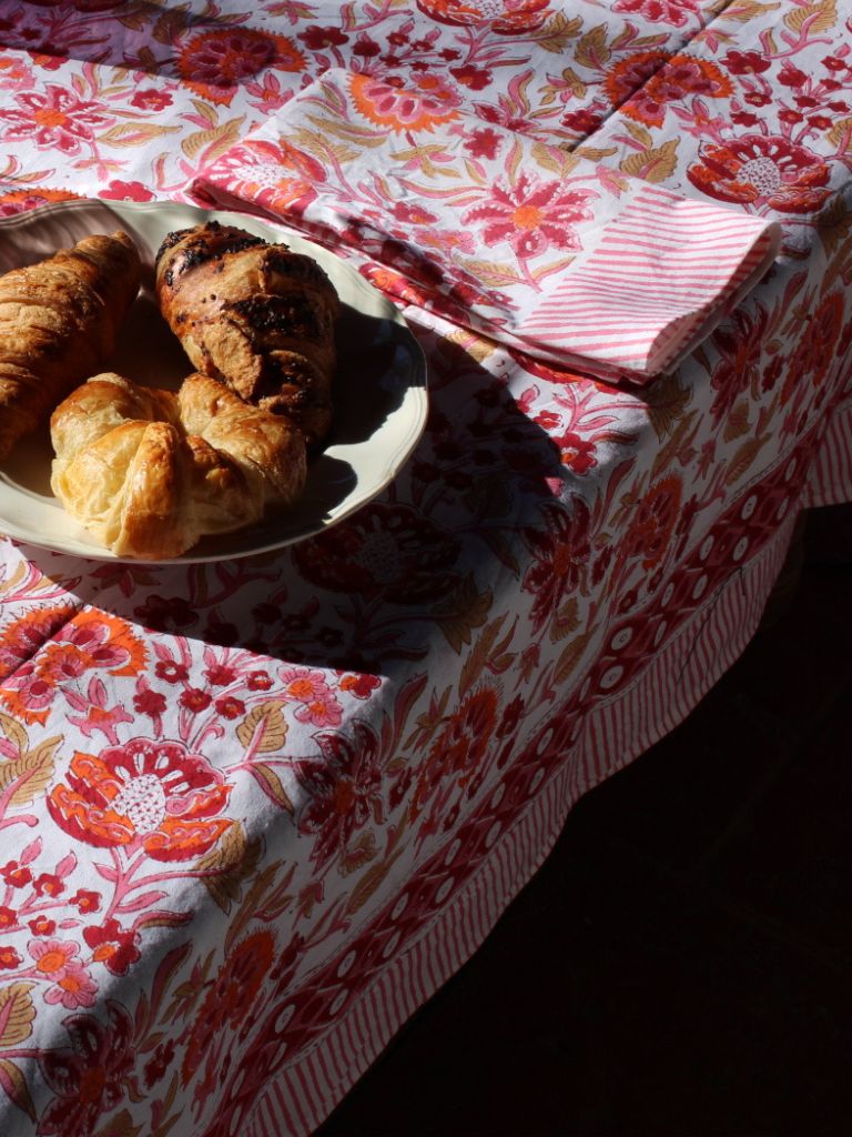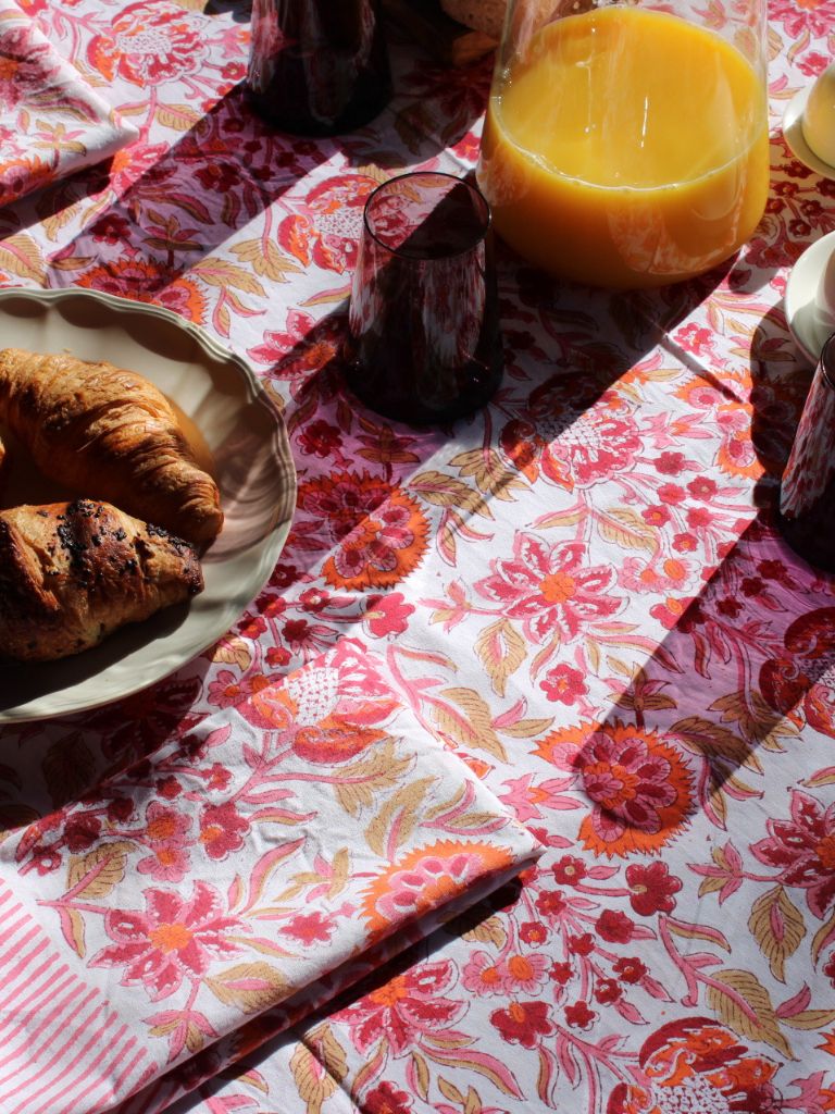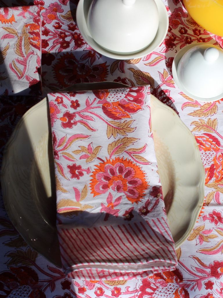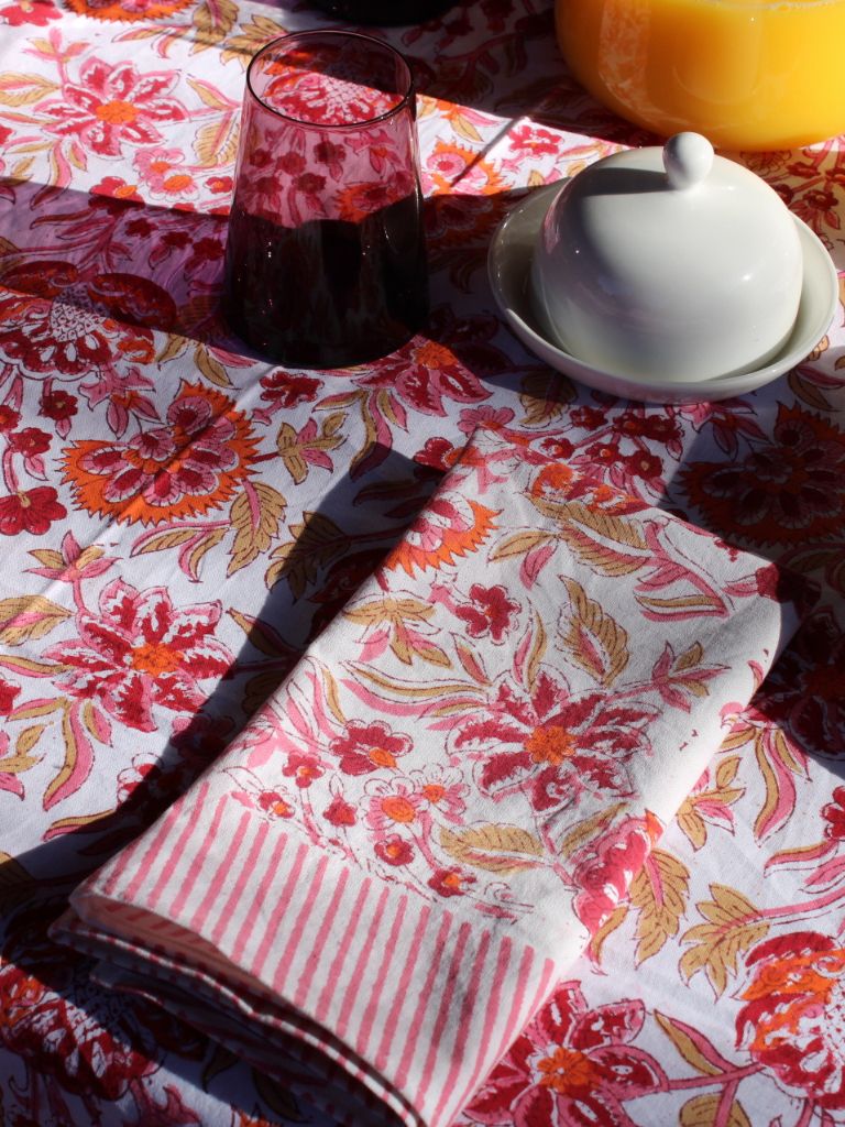 Mantel 100% algodón con estampado de flores en tonos rosas y naranja.