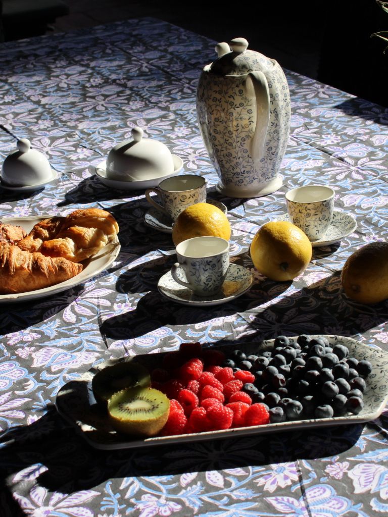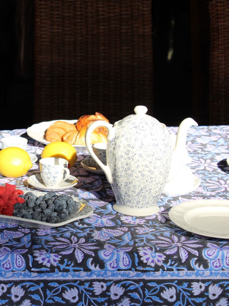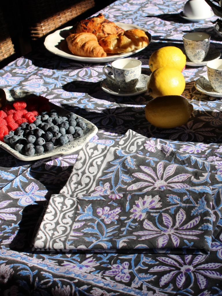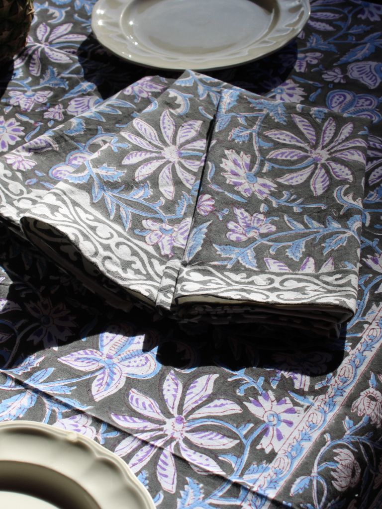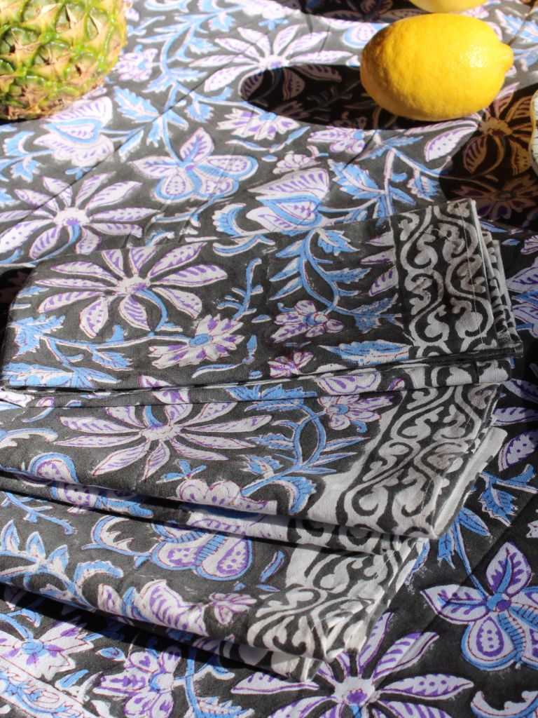 Mantel 100% algodón con estampado de flores en tonos grises y azules.