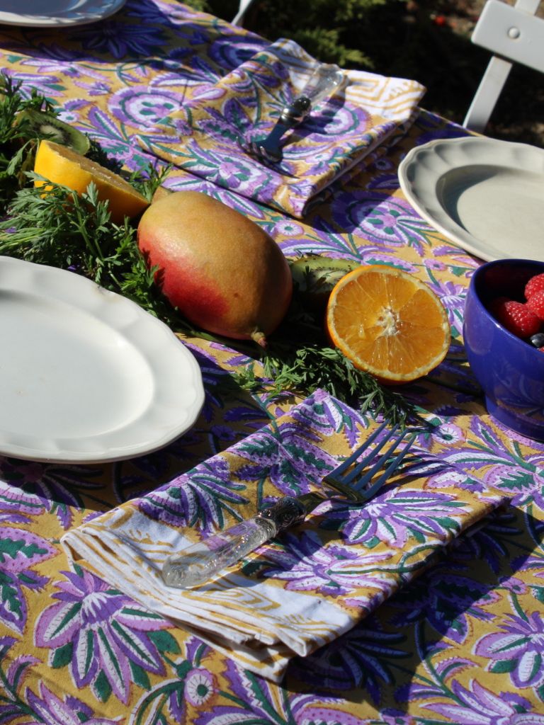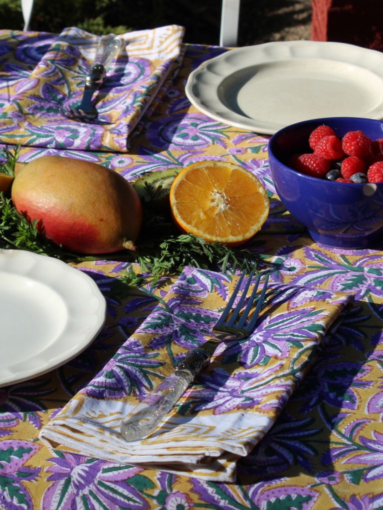Servilletas 100% algodón en tonos mostaza y violeta.