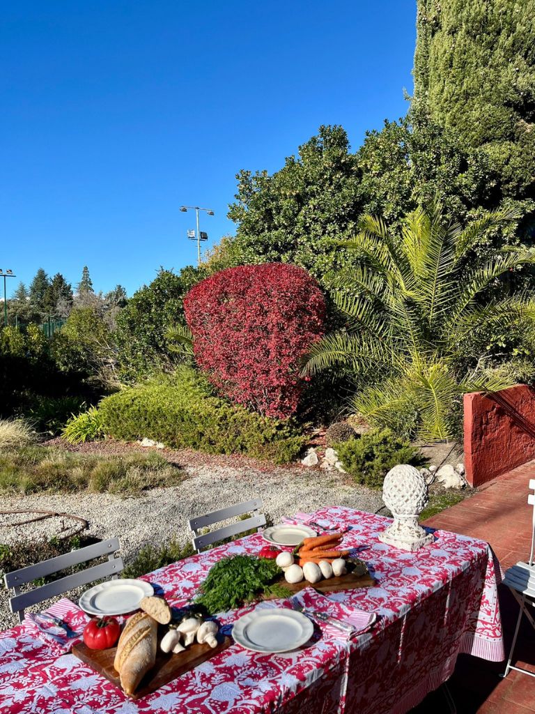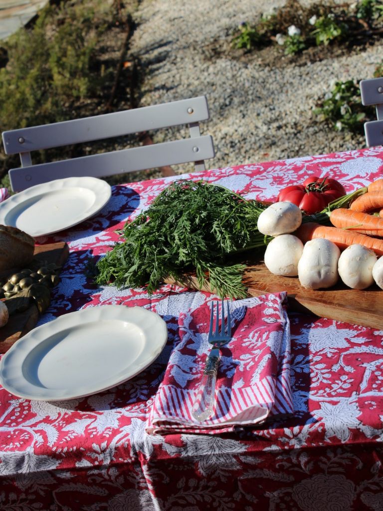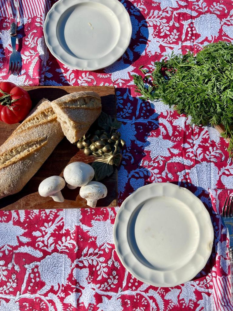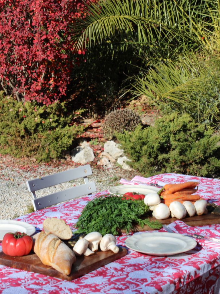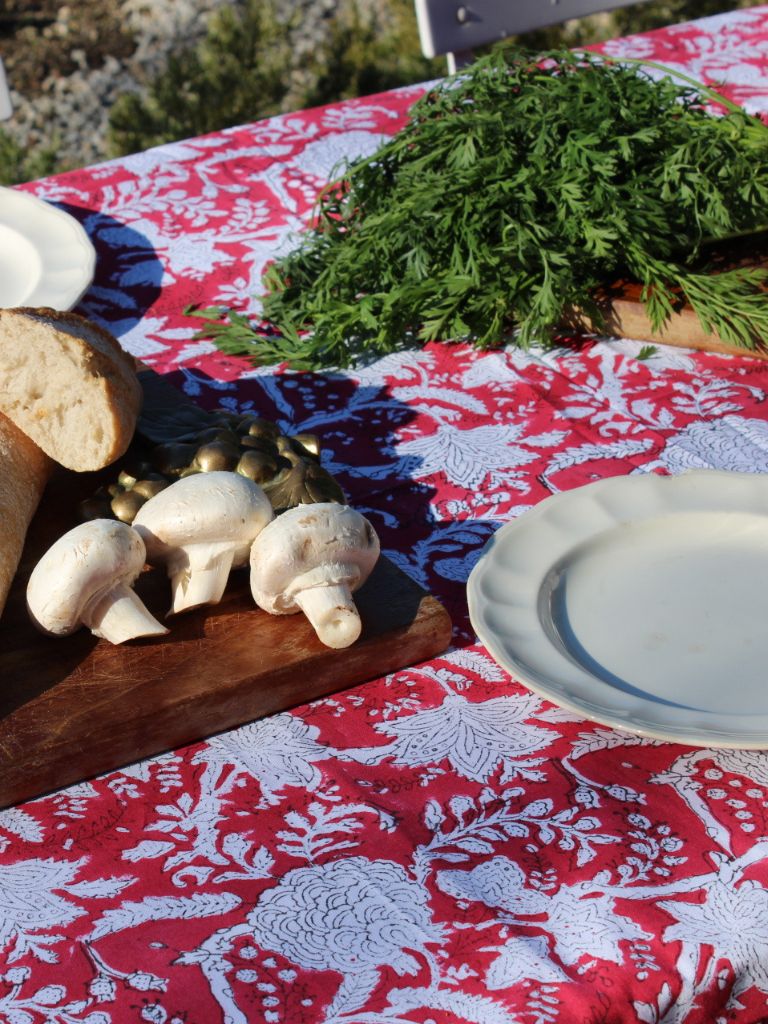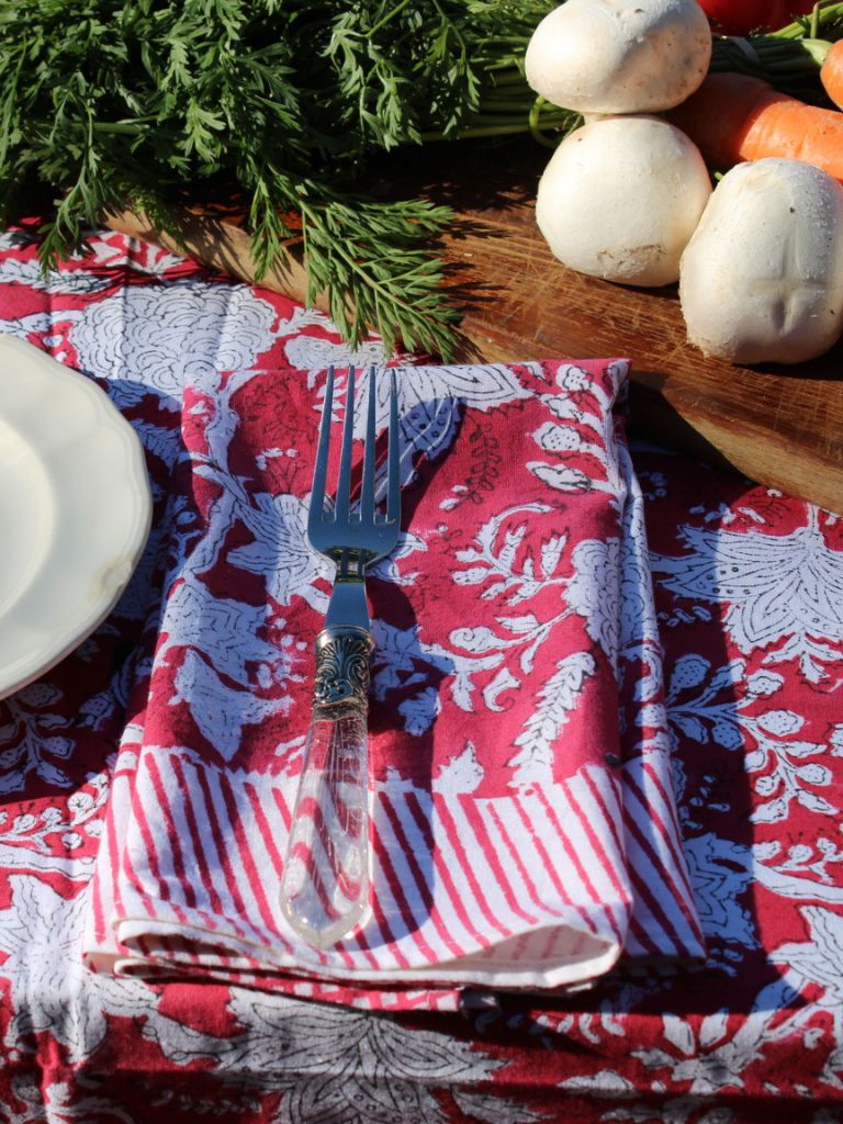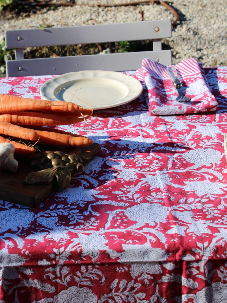 Mantel 100% algodón con estampado de flores en tono rojizo.